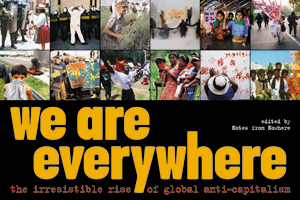 We wanted a way to document, broadcast, and amplify the sense of extraordinary possibility created by the multitudinous uprisings taking place across the world. So we combined our collective experiences, writings, ideas, and contacts to produce a book. We Are Everywhere is the result. It's a radical intervention in publishing - a celebration of direct action movements across the planet, unfiltered by the mainstream media, and told through the words and images of the people who were (and still are) there. Framing and connecting their stories are seven essays , written by the editors, which explain some of the defining characteristics of this movement. We've also included how-to boxes on direct action tactics. Running along the bottom of each page is a time-line of actions and victories which spans from 1994 with the Zapatista uprising to the present. Interspersed amongst everything else are gorgeous photographs, which capture the diversity and playfulness of our actions. These elements all add up to a real overview of the movement: where we came from, what we want, who we are, and where we're going. We Are Everywhere is history as it should be told. The Zapatistas, whose indigenous uprising inspired the world, have taught us, through their struggle founded on radical notions of dialogue and participation, to embark on a rebellion that listens. In this spirit, last year, we produced a 100 page preview booklet, "Notes from Everywhere," which we have given freely to activists at gatherings in Belgium, the UK, Bolivia, the US, Mexico, and Canada. The booklet was produced to inspire critique, ideas, and contributions to the final book, and this website aims to do the same. We Are Everywhere is anti-copyright, and will be available for free online. It is neither academic thesis nor art book, neither agitprop nor critical analysis, neither inspirational document nor DIY manual - but all of these, woven together using innovative graphic design and photographs. Texts, images and interviews with activists merge in both printed word and this website, creating a lively, polyphonic insight into the ideas and activities of the movements against capitalism and for life. We hope the result proves to be an inspirational, authentic document of insurrection. Que se vayan todos: Argentina's Popular Rebellion - a recent publication by some of the editors. Please note that this site is currently under construction and some sections are still unfinished. These will be added soon. |
